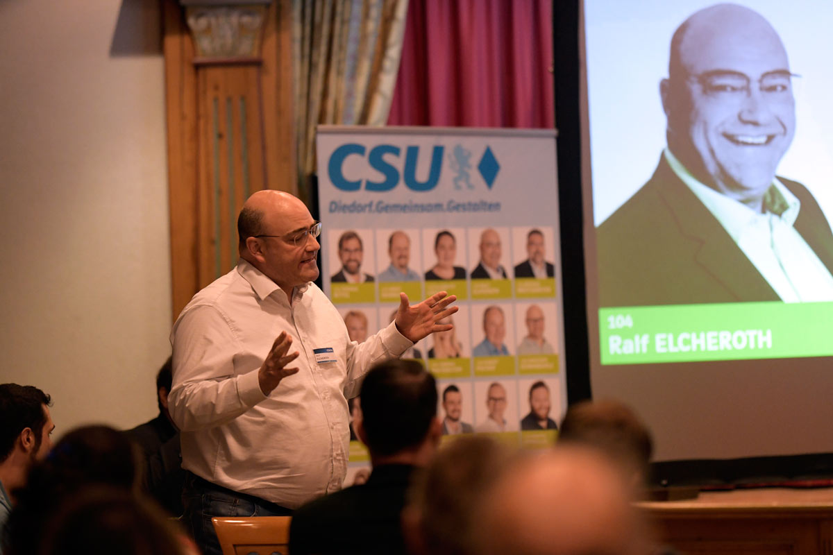 Aufgrund der Vorstellungsrunde der Kandidaten und des Bürgermeisterkandidaten Thomas Rittel traf man sich in verschieden Ortsteilen, diesmal war der Hauptort Diedorf an der Reihe. Die gut besuchte Veranstaltung konnte einen gut referierenden Thomas Rittel erleben, der vor allem bei der Diskussionsrunde fachlich voll überzeugen konnte.