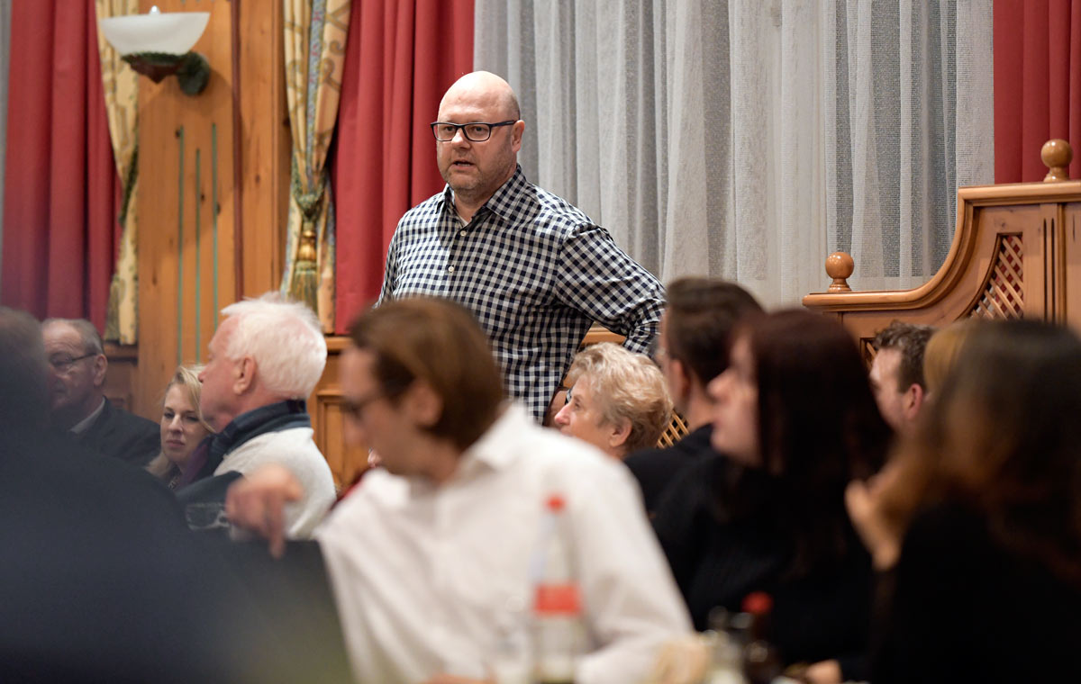 Auf die Frage aus dem Publikum, warum er sich gegen einen Anbau ausgesprochen hatte antwortete er, dass er vollumfänglich für den Anbau gestimmt hatte. „Allerdings werden wir ein großes Problem mit der Halle an sich bekommen“. Gerade den Brandschutz sieht er dort kritisch, hier wäre ein Gesamtkonzept sinnvoll gewesen, nicht nur eine Teillösung. „Hier werden wir mit Sicherheit nochmal Hand anlegen müssen“, resümierte er. Sein Lösungsvorschlag, für die 1-jährige Bauphase Bestandscontainer für Umkleiden und Duschen zu verwenden, damit die Sportler nicht im Regen stehen, wurde im Gemeinderat abgelehnt. Auf die Frage zur immensen Kostensteigerung beim Neubau des Kindergartens in Willishausen konnte er Stellung beziehen: „Wir, wie andere Fraktionen auch, waren immer für eine Veröffentlichung der Kosten. Ich lebe Transparenz und der Bürger hat ein Recht darauf, zu erfahren warum seine Steuergelder nicht zielgerichtet eingesetzt wurden. Die Mehrheit im Rat aus WfD und SPD hat dies leider verhindert.“